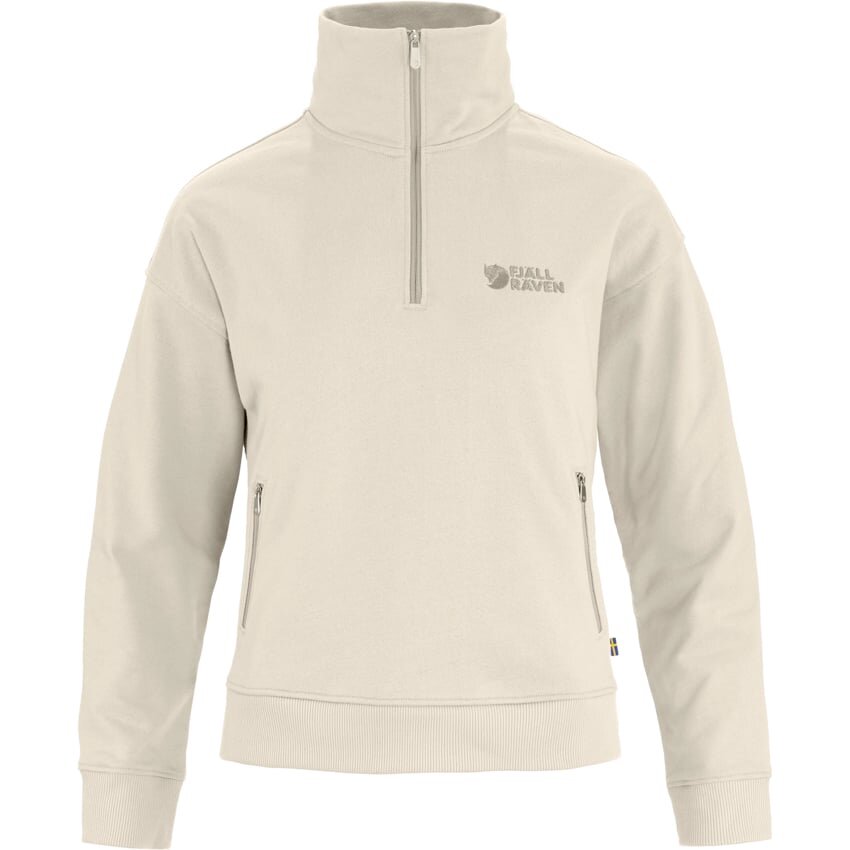 Classic Sweater with a Half Zip Made from a Triple-Thread Organic Cotton Fleece Fabric with a Smooth Outer and Looped Inside for Extra Warmth and Cosiness. Vardag Half Zip Sweater for Women Has a Boxy Cut and Ribbed Hem and Cuffs. Two Zippered Hand Pockets and Embroidered Logo on the Chest.